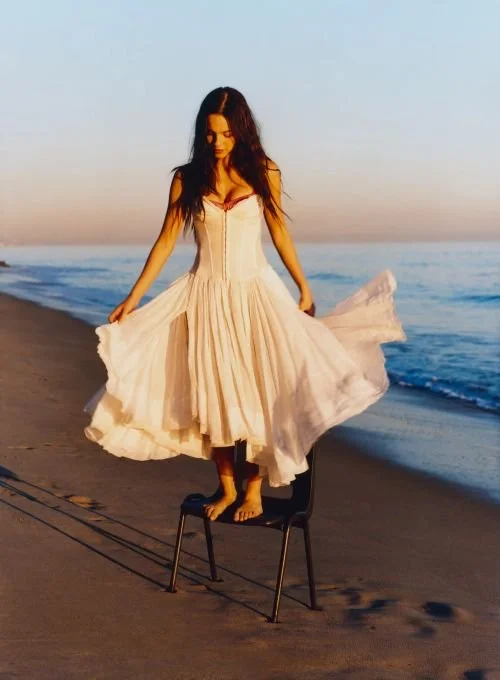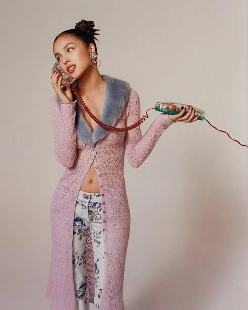 “Fans have been decoding clues about “OR3” in her every move. Teasers are on the way, but for now they’re sure it’ll be love songs and have a new colour theme (a shift from the purple that has been her signature) and another four-letter title (bets are on Luck). As she enters this new fashion era, Rodrigo reveals “my Pinterest is all babydoll dresses and ’70s necklines. I want it all to feel fun and laid-back.” As a magpie for unique vintage pieces, her stylists, LA-based sisters Chloe and Chenelle Delgadillo, write to tell me that they are “always on the hunt for special finds [for Olivia]. When we travel, we make a point to visit local vintage dealers.” Rodrigo is a personal fan of Lovers Lane and Vault Vintage when in Notting Hill, and Chloe and Chenelle add that, “Lately, we’ve been drawn to archive Miu Miu and Marc Jacobs.” They look to modernise the vintage references and create a style that is “effortless, feminine, with a slightly undone feel”.